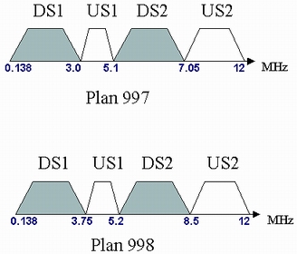 此標(biāo)準(zhǔn)從中國的實(shí)際情況出發(fā),既適應(yīng)接入網(wǎng)絡(luò)總體流量的非對稱特性,又考慮滿足一些對上行速率要求較高、接近對稱的業(yè)務(wù)需求;既考慮當(dāng)前技術(shù)和設(shè)備狀況,又兼顧未來技術(shù)發(fā)展和一段時(shí)期內(nèi)可能的業(yè)務(wù)需求,提出了中國的VDSL頻段劃分方式。這種方式在Plan998