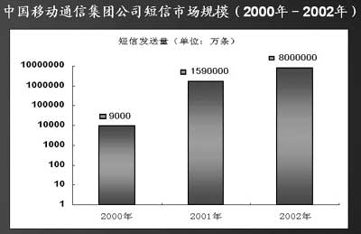 “從2001年的189億條增長到2002年的超過900億條,我國短信業(yè)務(wù)的增長率是移動(dòng)用戶數(shù)增長率的3.4倍! 計(jì)世資訊分析師許牧說。