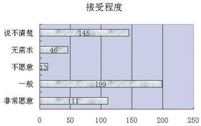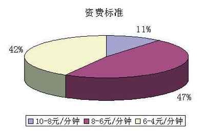 在調(diào)查中,67.4%的用戶對現(xiàn)有中國電信的資費(fèi)標(biāo)準(zhǔn)(10元/分鐘)表示不滿,32.6%的用戶表示滿意。但同時58%的用戶對能接受的資費(fèi)標(biāo)準(zhǔn)上又選擇了居中和較高的資費(fèi)標(biāo)準(zhǔn),表明用戶對視訊應(yīng)用產(chǎn)品的價格承受能力較高。