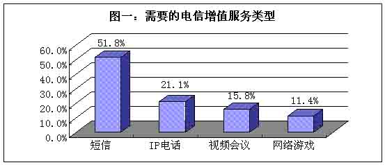 當(dāng)用戶(hù)被問(wèn)到“最需要的電信增值服務(wù)是什么?”,在短信、IP電話、視頻會(huì)議和網(wǎng)絡(luò)游戲這四個(gè)備選項(xiàng)當(dāng)中,超過(guò)一半的被訪者選擇短信;其次是IP電話,選擇此項(xiàng)的被訪者占據(jù)21%;再是視頻會(huì)議,選擇此類(lèi)多媒體通訊方式的被訪者約占16%;最后是網(wǎng)絡(luò)游戲,需要此類(lèi)增值服務(wù)的人約為10%。(見(jiàn)圖一)