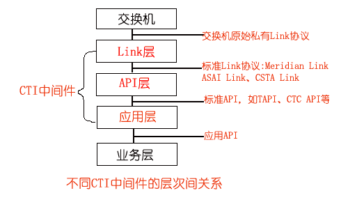 CTI中間件根據應用的層次和功能定位,一般可分為三種類型:Link層中間件、API層中間件和應用層中間件,分別實現不同的功能,并且前后緊密關聯。三種不同類型的CTI中間件的功能和相互關系示意圖如下所示: