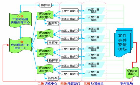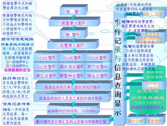 根據(jù)接過來的警情,應急聯(lián)動系統(tǒng)向處置力量部門發(fā)出指令派出處置力量編組到現(xiàn)場,并根據(jù)現(xiàn)場反饋回來的信息,決定是否增援或歸隊。事件記錄通過局域網(wǎng)被送到相應的處警員終端,處警員通過計算機輔助調(diào)度系統(tǒng)查詢相關資料,制定反應措施,并向相關聯(lián)動單位發(fā)出具體調(diào)度指令。在緊急事件發(fā)生時,相應的電子預案會被觸發(fā)啟動。如果發(fā)生了重大災難,險情或特殊的事件,則可以啟用城市緊急狀態(tài)指揮室,由首長進行統(tǒng)一指揮。