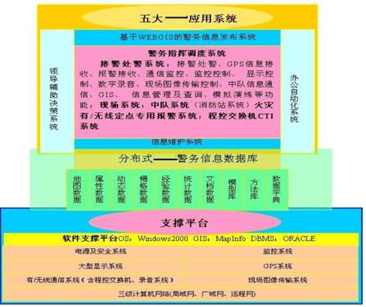 支撐平臺有計算機網(wǎng)絡系統(tǒng)、監(jiān)控系統(tǒng)、顯示系統(tǒng)、GPS系統(tǒng)、有/無線通信系統(tǒng)、圖像傳輸系統(tǒng)、電源及機房、軟件支撐平臺等。其中,計算機網(wǎng)絡系統(tǒng)包括指揮中心、二級指揮中心與移動指揮中心、業(yè)務執(zhí)行機構(gòu)(如:應急中隊、派出所等)之間的三級計算機網(wǎng)絡,即指揮中心局域網(wǎng)絡、業(yè)務機關網(wǎng)絡、與分支機關的廣域網(wǎng)絡、與移動指揮中心的遠程訪問網(wǎng)絡。指揮中心與二級指揮中心、分支機構(gòu)、移動中心之間有語音通信、數(shù)據(jù)通信,指揮中心與移動中心有語音通信、數(shù)據(jù)通信(無線)、現(xiàn)場圖像傳輸;指揮中心與公安其它機構(gòu)通過撥號網(wǎng)絡訪問(內(nèi)網(wǎng)),指揮中心與普通老百姓通過撥號網(wǎng)絡訪問(外網(wǎng))。