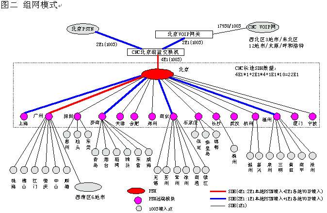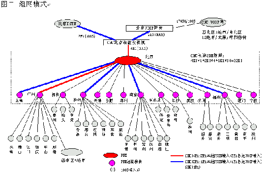 網(wǎng)通的客戶(hù)服務(wù)系統(tǒng)(1003呼叫中心)包括位于北京總部的總中心及其它全國(guó)30多個(gè)城市的分中心,全國(guó)范圍共有近200個(gè)接入點(diǎn)(覆蓋城市),共有200余座席,由總中心,交換機(jī)遠(yuǎn)端模塊接入點(diǎn)子中心及軟覆蓋接入點(diǎn)組成的三層架構(gòu)。參見(jiàn)下圖一《系統(tǒng)架構(gòu)》及圖二《組網(wǎng)模式》。