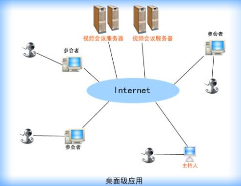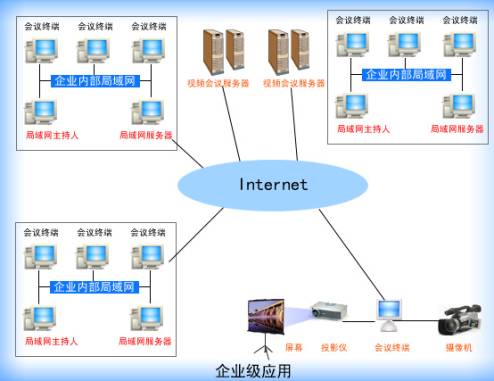 在企業(yè)級別的應(yīng)用中,企業(yè)將服務(wù)器構(gòu)架在公司內(nèi)部,遠程用戶及局域網(wǎng)內(nèi)部的用戶均可登錄服務(wù)器,實現(xiàn)交互。企業(yè)級視頻會議系統(tǒng)的應(yīng)用實際上就是將桌面級視頻會議與會議室級視頻會議系統(tǒng)有機的結(jié)合在一起,客戶端硬件外設(shè)可以按照以上的建議,根據(jù)各終端不同的需求進行配置。