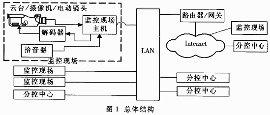 (1)前端監(jiān)控現(xiàn)場由監(jiān)控現(xiàn)場主機及一些外圍設備組成。外圍設備包括攝像機、電動鏡頭、云臺、防護罩、監(jiān)視器、多功能解碼器及報警器。監(jiān)控現(xiàn)場主機運行客戶前端軟件,實現(xiàn)視頻、音頻數(shù)據(jù)的實時采集、壓縮、解壓縮(音頻)(視頻傳輸