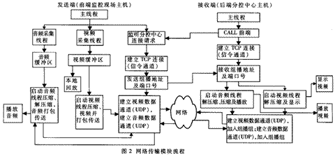 接收端(后端分控中心、服務器端)分控中心主機運行服務器端程序,在主線程中向前端監(jiān)控現(xiàn)場主機發(fā)出連接請求(CALL),三次握手建立TCP連接(信令通道);后端接收到組播地址及端口號后,啟動視(音)頻兩個線程,完成;利用Winsock2建立視(音)頻數(shù)據(jù)通道(UDP),加入視(音)頻組播組,接收壓縮視(音)頻包,并解碼顯示(播放);其中音頻線程,還要完成音頻數(shù)據(jù)包解碼顯示(播放);其中音頻線程,還要完成音頻數(shù)據(jù)包的壓縮、發(fā)送;實現(xiàn)視頻的單向傳輸、音頻的雙向傳輸。