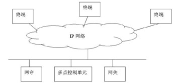 基于H.323的軟件視頻會(huì)議系統(tǒng)由相應(yīng)的協(xié)議族提供支持,使得這樣的系統(tǒng)能夠有很強(qiáng)的適應(yīng)性、兼容性。H.323建議的多媒體會(huì)議系統(tǒng)不是基于客戶(hù)服務(wù)器結(jié)構(gòu),而是基于傳統(tǒng)的電話(huà)呼叫網(wǎng)絡(luò)模式。H.323為基于網(wǎng)絡(luò)的通信協(xié)議定義了4個(gè)主要的組件:終端(Terminal)、網(wǎng)關(guān)(Gateway)、網(wǎng)守(Gatekeeper)和多點(diǎn)控制單元(MCU)。基本拓?fù)浣Y(jié)構(gòu)結(jié)構(gòu)如圖: