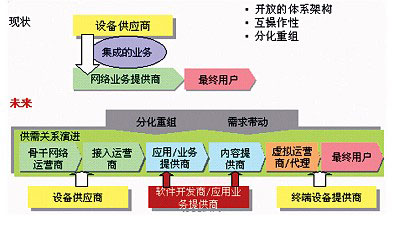 隨著市場對業(yè)務(wù)的需求越來越高,運營商扮演業(yè)務(wù)開發(fā)者和業(yè)務(wù)提供者角色將不再能夠滿足需求,新業(yè)務(wù)的提供速度與業(yè)務(wù)的種類都逐步處于劣勢,這時運營商需要放棄原來屬于自己的利益,從全業(yè)務(wù)提供商逐步演變?yōu)榫W(wǎng)絡(luò)提供商和網(wǎng)絡(luò)業(yè)務(wù)集成商。例如,通過與ICP/ISP的合作,構(gòu)造NGN業(yè)務(wù)價值鏈,提供包括網(wǎng)絡(luò)教育、網(wǎng)絡(luò)證券等寬帶增值服務(wù);通過開放的Parlay