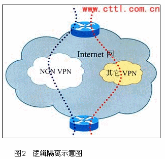 從圖2可以看出,邏輯隔離是在現(xiàn)有的運(yùn)營商數(shù)據(jù)網(wǎng)基礎(chǔ)上,利用已經(jīng)比較成熟的VPN(如MPLSVPN)技術(shù)將網(wǎng)絡(luò)資源進(jìn)行隔離:將網(wǎng)絡(luò)劃分為兩個(gè)邏輯子網(wǎng),一個(gè)是Internet業(yè)務(wù)子網(wǎng),另一個(gè)是NGN業(yè)務(wù)子網(wǎng)。兩個(gè)子網(wǎng)通過VPN進(jìn)行隔離。NGN業(yè)務(wù)與Internet業(yè)務(wù)的區(qū)分在邊緣路由器PE上完成,PE根據(jù)物理接口或邏輯接口區(qū)分業(yè)務(wù)的類型,邏輯接口可以是VLAN,PVC等。在NGN子網(wǎng)中,再有針對(duì)的對(duì)QoS以及安全等問題進(jìn)行解決。