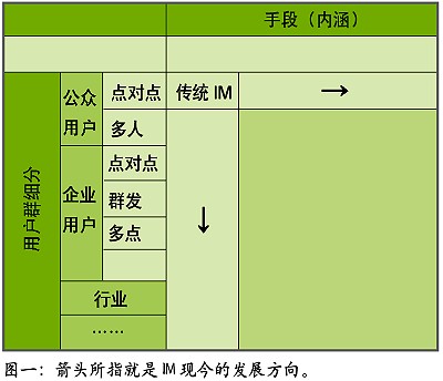 IT行業(yè)發(fā)展數(shù)十年,有一個共識,或是一種經(jīng)驗(yàn)結(jié)論,大約是:在用“老工具解決新問題”、“老工具解決老問題”、“新工具解決老問題”、“新工具解決新問題”四者中,一般最先者最善,也極討巧,最后者則最為事倍功半。觀IM發(fā)展趨勢,似乎介于“新工具解決老問題”、“新工具解決新問題”二者之間,就體現(xiàn)在表中兩個箭頭上,是以錢景堪憂。