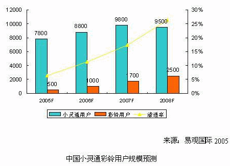 亞太領先的高科技智囊機構-易觀國際最新推出的《固網(wǎng)增值業(yè)務研究系列報告-彩鈴彩話2005》中,易觀預測,2005年國內(nèi)小靈通彩鈴用戶總數(shù)將達到500萬戶,市場規(guī)模為1.7億元人民幣;到2008年,小靈通彩鈴用戶有望達到2,500萬戶,市場規(guī)模將超過21億元人民幣。