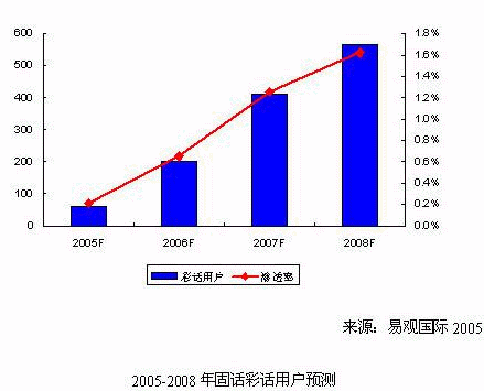 《固網(wǎng)增值業(yè)務研究系列報告-彩鈴彩話2005》中易觀國際認為,固話彩話業(yè)務將難以像小靈通彩鈴那樣得到廣泛的應用,但是能夠在細分市場中滿足固話用戶的個性化需求。易觀國際預測,2005年國內(nèi)固話彩話用戶總數(shù)將達到60萬戶,市場規(guī)模為1,000萬元人民幣;到2008年,固話彩話用戶超過550萬戶,市場規(guī)模將超過1.7億元人民幣。