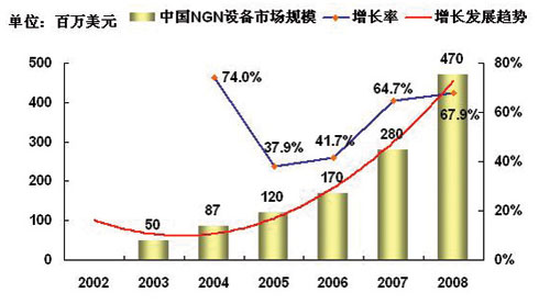 對于中國NGN市場規(guī)模的預(yù)測,主要取決于各個運營商在NGN方面的戰(zhàn)略發(fā)展重點,以及重點的投資方向。總體上來說,從2003年起,以IPTV、VOIP、寬帶接入等業(yè)務(wù)為代表的NGN的部分業(yè)務(wù)的推廣,使得事實上中國已經(jīng)形成一定的NGN的市場規(guī)模,盡管這一市場規(guī)模仍然很小。2004年中國的NGN基礎(chǔ)設(shè)備的市場規(guī)模超過8千萬美元,以后隨著各個運營商NGN戰(zhàn)略的進一步清晰,這一部分的投資會保持持續(xù)穩(wěn)定的增長,2005~2008年以后的NGN設(shè)備投資規(guī)模的平均增長率可以達到50%。