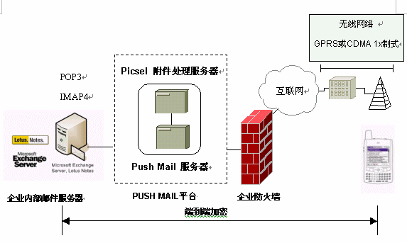 企業(yè)在其內(nèi)部放火墻內(nèi)安裝PUSH MAIL平臺,并在移動終端上安裝相應的PUSH MAIL客戶端軟件,可以將企業(yè)郵箱用戶現(xiàn)有的EMAIL帳號延伸到手機上,不改變用戶的使用習慣,可以瀏覽郵件的附件。采用端到端的加密措施,確保郵件的安全性。
