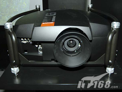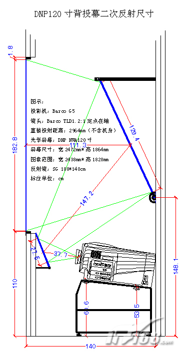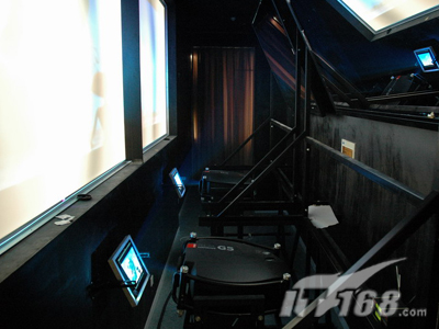 為了達(dá)到足夠大的尺寸,主屏幕采用SEAPRINE圖像控制器組成的1*2拼接,也就是采用了兩臺(tái)BARCO G5投影機(jī)來(lái)確保畫面的一流效果。不過(guò)由于投影距離的限制,這個(gè)方案里采用了二次反射系統(tǒng)。這也是這套方案的一個(gè)要點(diǎn)和關(guān)鍵。因?yàn)楹芏喙こ處熇靡恍└怕蕘?lái)估算一次或多次折射可以縮短的投影距離,但欠缺科學(xué)和嚴(yán)謹(jǐn)?shù)膽B(tài)度,因?yàn)檫@個(gè)數(shù)據(jù)與屏幕安裝高度、投影方式(離軸或偏軸)、投影機(jī)體積、反射鏡面積等息息相關(guān)。
