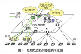 隨著PSTN用戶逐步轉(zhuǎn)變?yōu)檐浗粨Q網(wǎng)絡用戶,未來以軟交換網(wǎng)絡為核心、PSTN端局作為接入的網(wǎng)絡結(jié)構(gòu)將逐步形成。如圖4所示,軟交換網(wǎng)絡將覆蓋包括PSTN用戶在內(nèi)的各種類型的用戶終端,具有SSP功能,提供智能網(wǎng)業(yè)務;具備大容量關口局功能,實現(xiàn)與其他運營商網(wǎng)絡的互通。