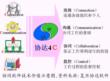 協(xié)同軟件在IT應用價值上的體現(xiàn),主要在于通過網(wǎng)絡提供一個跨組織、跨區(qū)域的虛擬工作場所及相關(guān)應用工具。參考產(chǎn)品競爭力位居第一的復旦協(xié)達CTOP V4.0 ,協(xié)同軟件圍繞著構(gòu)建網(wǎng)上虛擬工作場所,在IT應用上所體現(xiàn)的價值,主要是4C,即:"連接Connection、溝通Communication、協(xié)作Collaboration、監(jiān)控Control",這也是協(xié)同軟件的主要IT技術(shù)價值的體現(xiàn)。