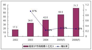 繼2004年中國政府和運(yùn)營商監(jiān)管力度的加大,2005年的短信SP市場規(guī)模增長率為32%,SP市場規(guī)模55.5億元,比2004年略有上升;谀壳岸绦攀袌鲈隽渴袌龅目s小,其增長主要依靠對存量市場需求的深度挖掘。諾盛預(yù)計2006年的短信市場繼續(xù)保持平穩(wěn)的增長勢頭,增長率將達(dá)29%。