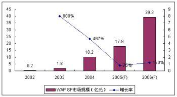 2005年中國運(yùn)營商對WAP沉默用戶的清理和一系列內(nèi)容監(jiān)管措施使得WAP市場前兩年的高速增長勢頭減緩,SP市場規(guī)模增長率下探至75%,規(guī)模達(dá)17.9億元。諾盛預(yù)計由于運(yùn)營商監(jiān)管政策的連續(xù)性及其對免費(fèi)WAP網(wǎng)站的政策調(diào)整,2006年的WAP市場仍然無法恢復(fù)2004年以前的高速增長勢頭,但增長率略有回暖,達(dá)到120%。