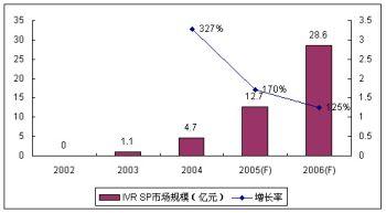 由于運(yùn)營商的監(jiān)管和增量市場需求的減少,2005年IVR高速增長的勢頭有所回落,市場增長速度趨于理性,SP市場份額增長率為170%,整體SP市場份額達(dá)到12.7億元。諾盛預(yù)計2006年IVR市場增長率將繼續(xù)回調(diào),但絕對增長率仍然較快,達(dá)到125%。