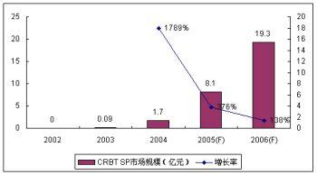在運(yùn)營商的大力推動和SP/CP的積極努力下,無線音樂市場從2004年起進(jìn)入了井噴時期。CRBT業(yè)務(wù)具有的病毒式營銷特性使得CRBT業(yè)務(wù)的滲透率增長迅速,但其時尚特性又使得業(yè)務(wù)的滲透率高峰很容易達(dá)到、業(yè)務(wù)縱深有限。2005年,CRBT的SP市場規(guī)模增長率為376%,較上一年的高速增長有所回落。諾盛預(yù)計2006年運(yùn)營商和SP/CP仍然會力推CRBT業(yè)務(wù)。在產(chǎn)業(yè)鏈積極推動和用戶滲透率高峰已經(jīng)逼近的雙重制約下,諾盛預(yù)計CRBT業(yè)務(wù)的SP市場規(guī)模增長率為138%,整體SP市場規(guī)模達(dá)到19.3億元。