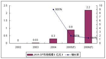 作為SP和移動運(yùn)營商都非?春玫臉I(yè)務(wù),JAVA業(yè)務(wù)受到眾多SP的青睞。盡管作為JAVA主要業(yè)務(wù)的手機(jī)游戲目前盈利狀況普遍欠佳,但空中網(wǎng)、美通無線、數(shù)字魚等SP仍然大量投入,期待著未來業(yè)務(wù)的高速增長。受制于終端和JAVA游戲的表現(xiàn)力,2005年JAVA業(yè)務(wù)的SP市場規(guī)模增長率回落到200%,諾盛預(yù)計2006年JAVA的使用環(huán)境沒有太大變化,其增長率進(jìn)一步回落至144%。