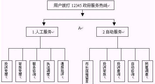 當用戶撥通"12345"電話并選擇自動服務(wù)時,聲訊臺自動播放引導(dǎo)語"選擇市長信箱留言請按1,自動投訴舉報請按2,投訴查詢請按3,服務(wù)咨詢請按4,民意調(diào)查請按5。
