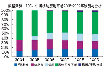 與此同時(shí),中國移動(dòng)增值電信業(yè)務(wù)占移動(dòng)運(yùn)營商的業(yè)務(wù)收入比重不斷增加,根據(jù)IDC統(tǒng)計(jì),2004年中國移動(dòng)增值服務(wù)市場(chǎng)的個(gè)人應(yīng)用市場(chǎng)達(dá)到340億元人民幣,該市場(chǎng)在2009年將達(dá)到880億元人民幣,其2004年~2009年復(fù)合年平均增長(zhǎng)率為15.3%。