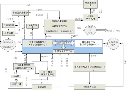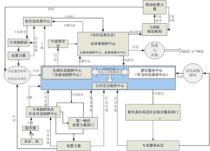 指政府決策指揮中心、先期指揮中心、便民服務(wù)中心、公共安全監(jiān)控中心,通常還有移動(dòng)指揮中心和災(zāi)備中心,以及其它節(jié)點(diǎn)的建設(shè)。一般地,先期指揮中心與便民服務(wù)中心可互為備份。政府決策指揮中心對重大、特別重大突發(fā)公共事件進(jìn)行協(xié)調(diào)、決策,偏重于自然災(zāi)害與生產(chǎn)安全方面,而一般、較重突發(fā)公共事件仍保持由各專業(yè)指揮部指揮、處置,只有當(dāng)跨區(qū)、跨機(jī)構(gòu)需要協(xié)調(diào)時(shí)由政府決策指揮中心進(jìn)行協(xié)調(diào)。