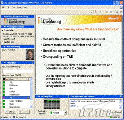 Microsoft Office Live Meeting實時會議:它使Web會議變得容易,它提供一個互動的Web空間進行會議。在Web空間上面,參會人員能共享文件、音頻視頻流、以及協(xié)同工作。通過Live