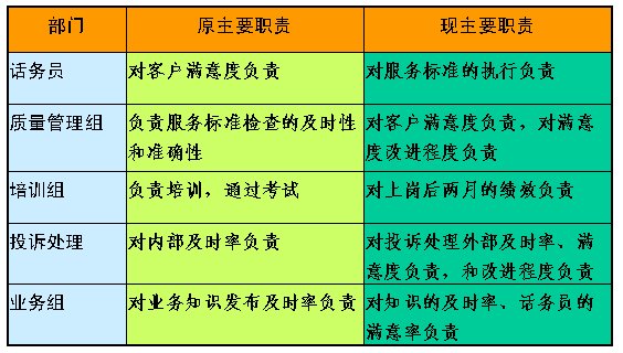 首先,要根據組織的目標來確定我們需要哪些流程,即需要哪些流程才能保證組織目標的實現;其次,根據流程的需要,即為了保證流程的有效運行,來劃分不同部分的職責;最后,根據各部分職責的劃分來設置組織的架構。如我們根據客服中心流程運行的需要,對組織架構和相關班組的主要職責進行了調整,以保證流程的有效順暢運行。如部分班組的主要職責調整如下: