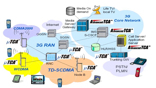 3G網(wǎng)絡(luò)中占主要地位的三個(gè)無線接入標(biāo)準(zhǔn)是WCDMA、TD-SCDMA與CDMA2000。3GPP與業(yè)界廠商對網(wǎng)絡(luò)結(jié)構(gòu)的標(biāo)準(zhǔn)化做出的杰出努力,為在世界范圍內(nèi)成功布署3G網(wǎng)絡(luò)業(yè)務(wù)起到了至關(guān)重要的作用。不過,3G網(wǎng)絡(luò)是復(fù)雜的系統(tǒng),包含有多種多樣的網(wǎng)元設(shè)備,AdvancedTCA與MicroTCA技術(shù)的出現(xiàn)把它的實(shí)現(xiàn)方式引向了標(biāo)準(zhǔn)化的道路,即通過商用組件快速、低成本地布署3G網(wǎng)絡(luò),減少了各種獨(dú)立的實(shí)現(xiàn)方式的復(fù)雜性,提高了互操作性。 圖 1: 3G 網(wǎng)絡(luò)結(jié)構(gòu)