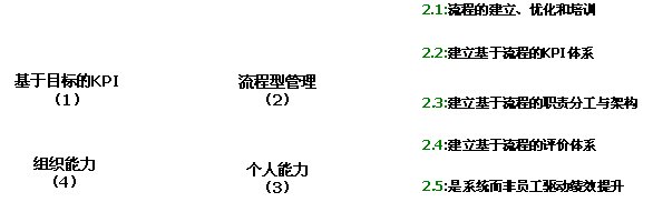 因此,要有效實施“流程型”管理,必須在我們日常管理的內容、KPI體系、組織架構、績效評價體系和組織發(fā)展的驅動力五個方法實施同步的轉變,才能有效建立流程文化,保證整個組織對流程的理解和重視,提高組織的執(zhí)行能力,通過“組織能力”保證組織目標的實現(xiàn),而非依賴個體能力。