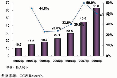 圖 2002—2008年中國視頻會(huì)議系統(tǒng)市場規(guī)模