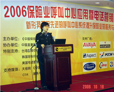 。。2006年10月18日,2006保險(xiǎn)業(yè)呼叫中心應(yīng)用暨電話營(yíng)銷(xiāo)高峰研討會(huì)在北京天鴻科園大酒店隆重召開(kāi),以下是K1主題演講實(shí)錄: