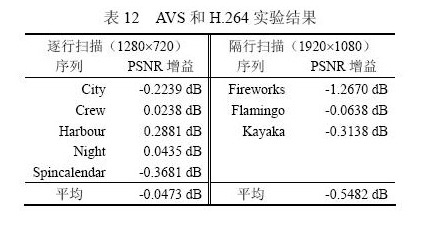profile的客觀編碼性能。結果為相同碼率條件下峰值信噪比PSNR的增益?梢钥闯,AVS相對于MPEG-2標準編碼效率平均提高2.56dB,相比于H.264標準編碼效率略低,平均有0.11dB的損失。