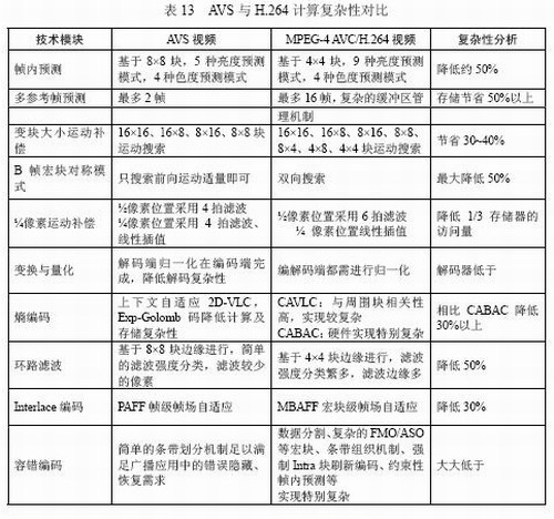 表13對AVS與H.264的計算實現(xiàn)復雜性進行扼要對比,大致估算,AVS解碼復雜度相當于H.264的30%,AVS編碼復雜度相當于H.264的70%。