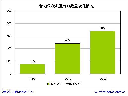 近兩年移動(dòng)QQ的市場規(guī)模迅速擴(kuò)大,iResearch研究結(jié)果顯示2006年移動(dòng)QQ用戶規(guī)模達(dá)到680萬人,移動(dòng)QQ所帶來的現(xiàn)金收入成為騰訊上市公司最重要的收入之一。移動(dòng)IM與互聯(lián)網(wǎng)IM最大的不同在于產(chǎn)業(yè)鏈移動(dòng)運(yùn)營商的參與。艾瑞認(rèn)為互聯(lián)互通是移動(dòng)IM產(chǎn)業(yè)整合和發(fā)展必然趨勢。