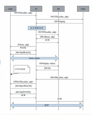 Session Progress 響應(yīng),從而在主叫和MS之間建立早期媒體流。AS向MS發(fā)送指示播放視頻的INFO消息,MS直接向主叫播放定制的精彩視頻。當(dāng)被叫摘機(jī)后,AS收到帶被叫SDP的200