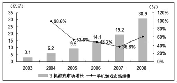 國內(nèi)手機(jī)游戲市場在過去的幾年里呈現(xiàn)快速發(fā)展的趨勢。2004年增長率接近100%,2005年也有50%以上的增長。但最近兩年國內(nèi)整個(gè)手機(jī)游戲市場隨著手機(jī)普及率的增速放緩也進(jìn)入了盤整期。iResearch咨詢估計(jì),從2005年至2007年,國內(nèi)手機(jī)游戲市場的收入規(guī)模盡管仍然處于上漲趨勢,但年增長率逐年下降,2008年后隨著市場環(huán)境更加成熟理性,年增長率將會(huì)出現(xiàn)反彈,升至60%以上。