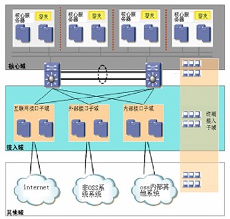 OSS管理者在保證及時(shí)準(zhǔn)確的提供信息服務(wù)的基礎(chǔ)上,應(yīng)該按不同的安全級別研究對安全域進(jìn)行劃分,確認(rèn)那些為核心子域,那些為接入域,那些為其他域。通過對不同的安全域進(jìn)行不同的安全策略劃分,保證如上的安全域所享受的安全級別是不同的。圖1顯示,核心域、接入域和其他域是第次接入的,向下訪問可以透明傳輸,而向上的訪問就必須設(shè)定相應(yīng)的訪問控制。
