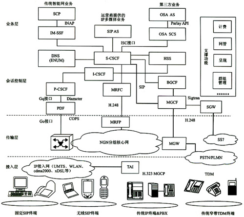 接入層支持各種有線和無線終端。固定和無線SIP終端可通過IP接入網(wǎng)直接鏈入,非SIP終端(如H.323)必須通過TAI(終端適配接口)完成H.323和SIP的轉(zhuǎn)換才能接入IP接入網(wǎng)。各種寬帶IP終端可通過MGW、MGCF、SGW實現(xiàn)與PSTN/PLMN域的傳統(tǒng)窄帶TDM(時分復(fù)用)終端實現(xiàn)互通。