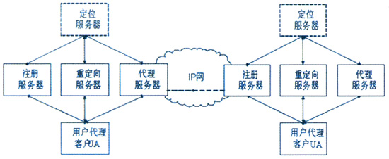 圖1描述了SIP的基本網(wǎng)絡(luò)體系結(jié)構(gòu)。用戶接入網(wǎng)絡(luò)后首先要向注冊服務(wù)器注冊,注冊信息寫入定位服務(wù)器中(定向服務(wù)器不屬于SIP網(wǎng)元,只是一個(gè)數(shù)據(jù)庫)。當(dāng)用戶代理客戶UAC要發(fā)起呼叫時(shí),它一般將呼叫請求消息發(fā)送給本域的出向代理服務(wù)器。媒體描述信息以SDP(SessionDescriptionProtocol)的形式在SIP消息體中被封裝并發(fā)送出去。代理服務(wù)器檢查被叫地址,將請求轉(zhuǎn)發(fā)(可能經(jīng)過多個(gè)中間代理服務(wù)器的轉(zhuǎn)發(fā)),直至到達(dá)被叫域的代理服務(wù)器。被叫域的代理服務(wù)器通過查詢定位服務(wù)器確定被叫的確切位置,然后將請求轉(zhuǎn)發(fā)給被叫用戶代理服務(wù)器UAS。被叫UAS收到請求后,生成響應(yīng)消息。響應(yīng)消息將按照請求消息經(jīng)過的路徑,原路返回到主叫UAC。主叫UAC根據(jù)響應(yīng)消息的內(nèi)容選擇是建立呼叫、重新發(fā)起呼叫或取消該呼叫。如果被叫沒有在歸屬地,主叫將通過重定位服務(wù)器重新定位被叫的位置,然后發(fā)起請求。