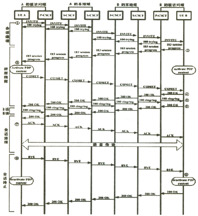 B接受了這個(gè)會話請求,但此時(shí)他不回鈴?fù)ㄖ狝,他返回183sessionprocess應(yīng)答表示他接受該會話,同時(shí)要求A對此表示確定,這個(gè)應(yīng)答通過各個(gè)CSCF傳給A。同時(shí)B激活一個(gè)GPRSPDP上下文,它被用來通過IMS的IP接入點(diǎn)來建立語音通道。