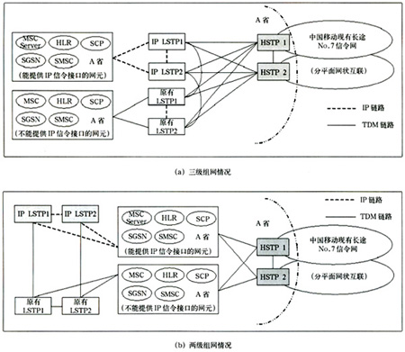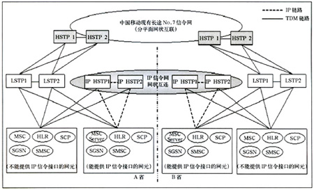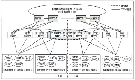 該種方案情況下,省內(nèi)支持IP信令的網(wǎng)元直接與IP LSTP相連(兩級組網(wǎng)情況下還需要通過TDM方式與現(xiàn)有HSTP相連),不支持IP信令的網(wǎng)元仍保持原有連接方式與現(xiàn)有LSTP相連(兩級組網(wǎng)情況下還要與HSTP)。省際信令消息仍由現(xiàn)有長途No.7信令網(wǎng)疏通,省內(nèi)信令由LSTP疏通。