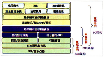 當前國內(nèi)IPTV業(yè)務(wù)試點中采用的機頂盒,包括華為、中興、UT等主流廠商都主要采用了基于DSP架構(gòu)的技術(shù)解決方案,除能滿足點播、直播等標清業(yè)務(wù)需求外,還可通過軟件升級,以支持信息瀏覽、簡單的本地/網(wǎng)絡(luò)游戲等增值業(yè)務(wù),基本上可滿足上述業(yè)務(wù)一定規(guī)模用戶商用要求。
