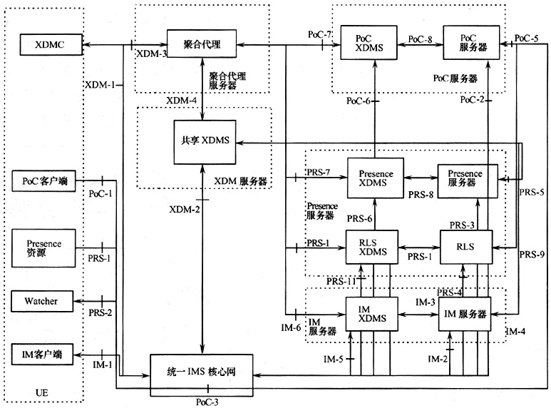OMA雖然定義了XDM、Presence(呈現(xiàn))、Instant Message和PoC等業(yè)務(wù)的功能實(shí)體和參考點(diǎn),但是為了在網(wǎng)絡(luò)中實(shí)現(xiàn)以上業(yè)務(wù),需要將OMA定義的功能實(shí)體和參考點(diǎn)映射成物理實(shí)體和協(xié)議,確定運(yùn)營商開放此類業(yè)務(wù)對設(shè)備和協(xié)議的要求,圖2給出了一種映射的方式。XDM服務(wù)器包含的共享XDMS功能提供公共群組的能力,有利于用戶在使用PoC、IM等業(yè)務(wù)時(shí)也能共享此群組。