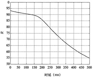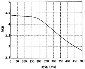 對實時的語音和視頻業(yè)務(wù)來說,業(yè)務(wù)數(shù)據(jù)端到端的時延最為關(guān)鍵,從仿真結(jié)果圖6和圖7可以看出時延對R系數(shù)和MOS值的影響:隨著時延的增加,R系數(shù)和MOS值都降低,即語音質(zhì)量變差。當時延大于150ms時,語音質(zhì)量下降的比較厲害。