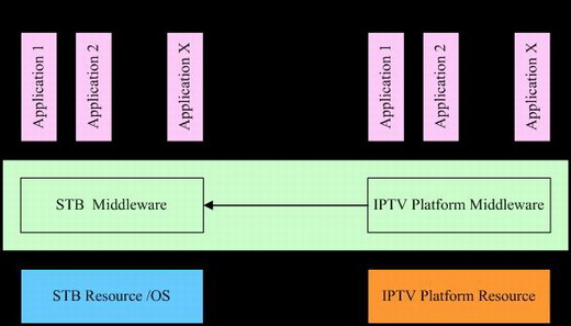 IPTV中間件可以有多種實現方式,其核心作用是將應用程序和底層系統(tǒng)資源隔離開來,任何按照某中間件提供的應用程序編程接口實現的應用程序可以運行在該中間件之上;另一個重要的作用是實現應用與應用之間的交互。